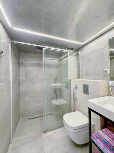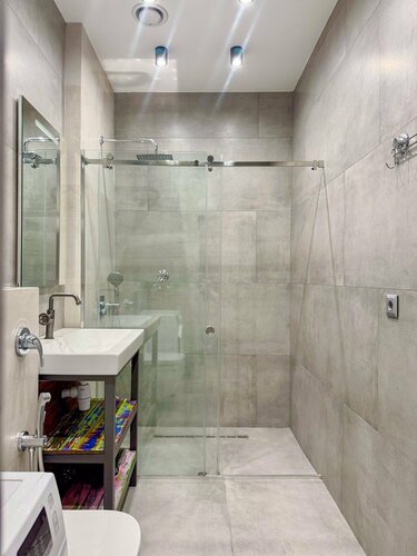На полу 1-го этажа и в ванных комнатах - широкоформатный керамогранит,